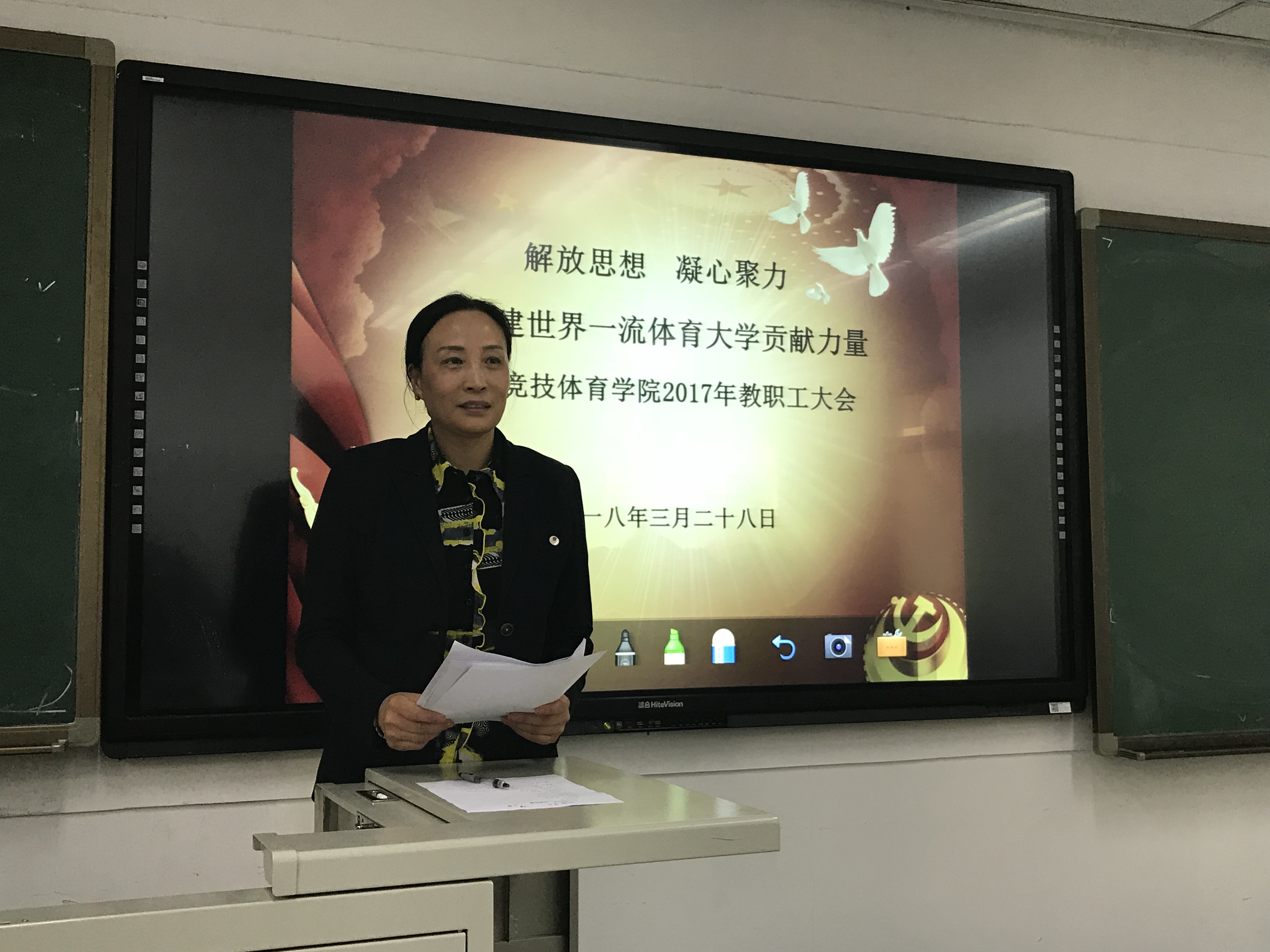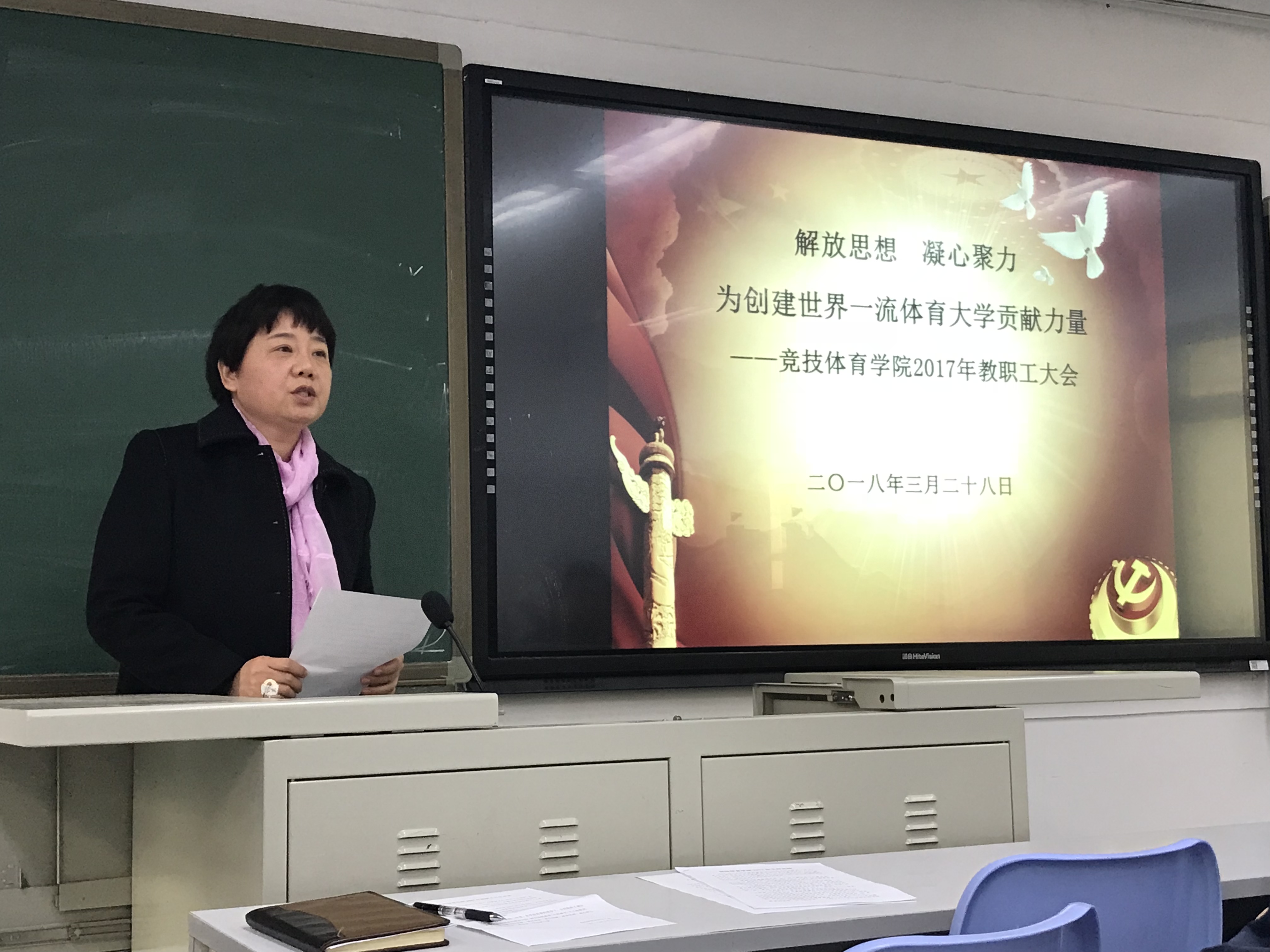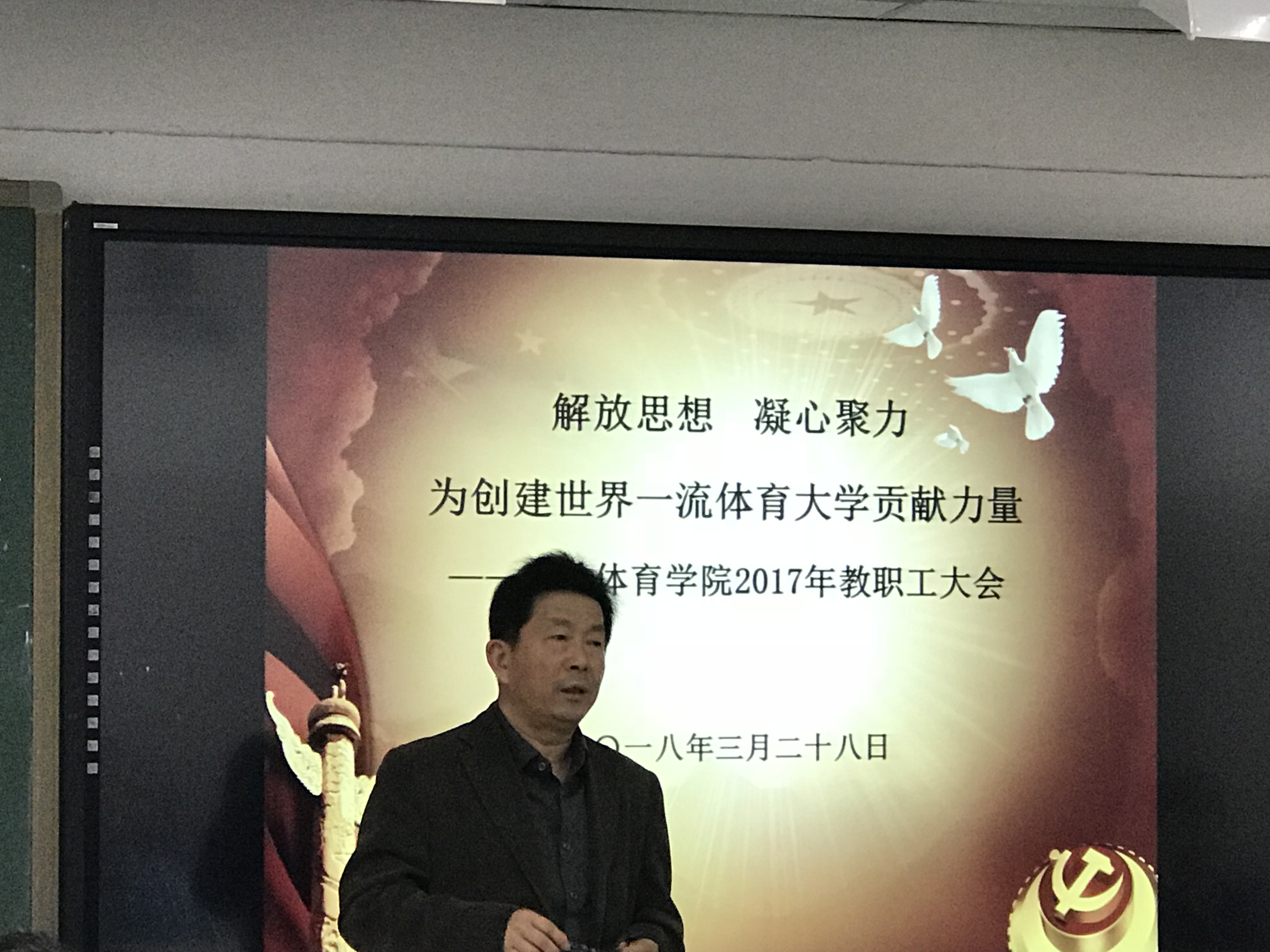 2018年3月28日,best365英国在线体育召开了以“解放思想,凝心聚力,为创建世界一流体育大学贡献力量”为主题的教职工大会。学院分工会主席尚迎秋、院长马冰、副院长左琼及全体教师参加了会议。