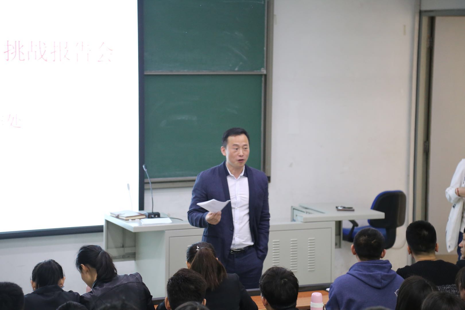 在全场学生的留学之魂被花老师点燃之后,辅导员尹老师又为同学们打了一针强心剂。尹老师向大家报告了我院研究生国际化培养工作开展情况,我院将为学生们提供越来越多的国际化项目。希望研究生们不要局限于研究生学位的取得,而是着手未来。在学校大力发展国际化的政策背景下,抓住机会,早日攻破英语大关,勇敢迈出自己国际化之路的第一步。