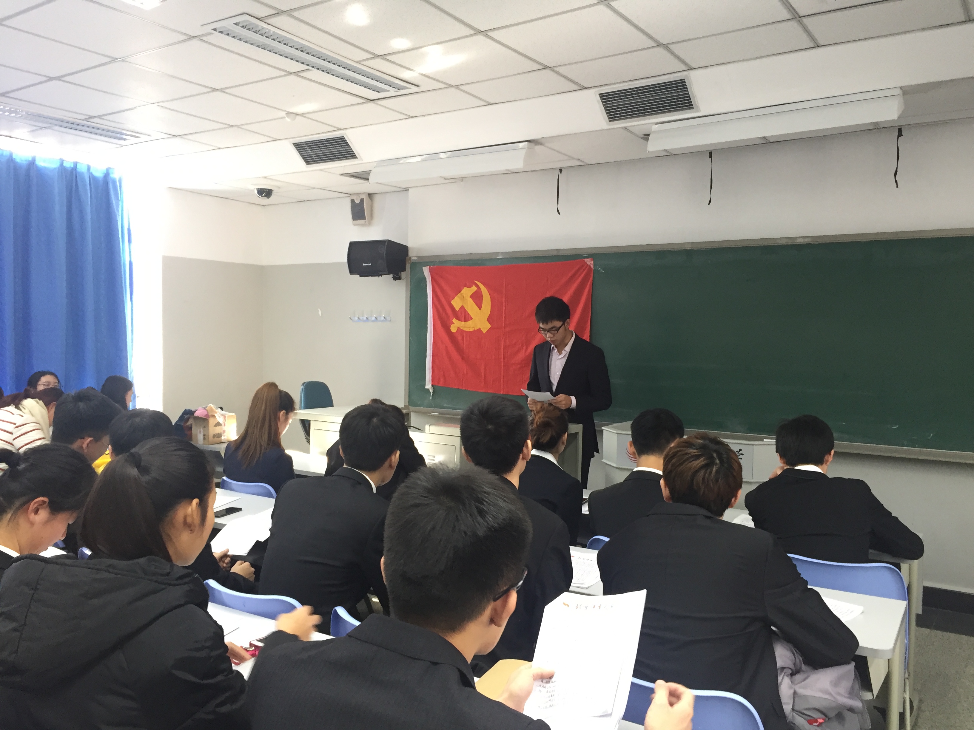 会议开始,全体起立奏唱国际歌。发展对象宣读《入党志愿书》,汇报其对党的认识,学习党章的体会及入党动机。由支部书记高静怡宣读支部决议,采取无记名投票方式,一致同意吸收冯润泽、徐欢腾等31名同学正式成为中国共产党预备党员。