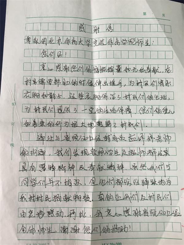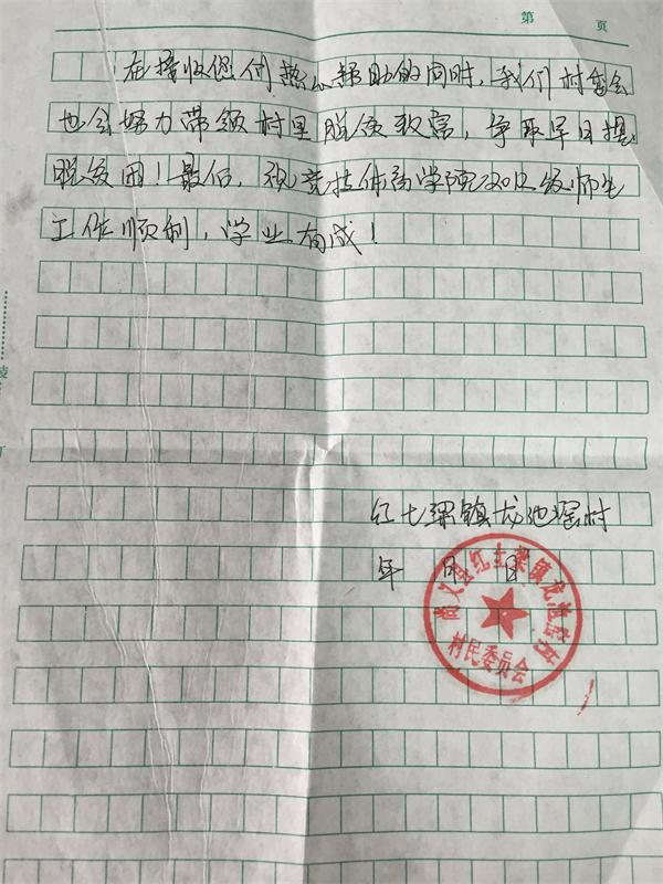 近日,best365英国在线体育2012级收到了一封来自河北省尚义县红土梁镇的感谢信。信件简短却充满真情,语言朴实却不乏感动,对best365英国在线体育2012级全体师生过去两年爱心捐助的行为表达了感激之情。