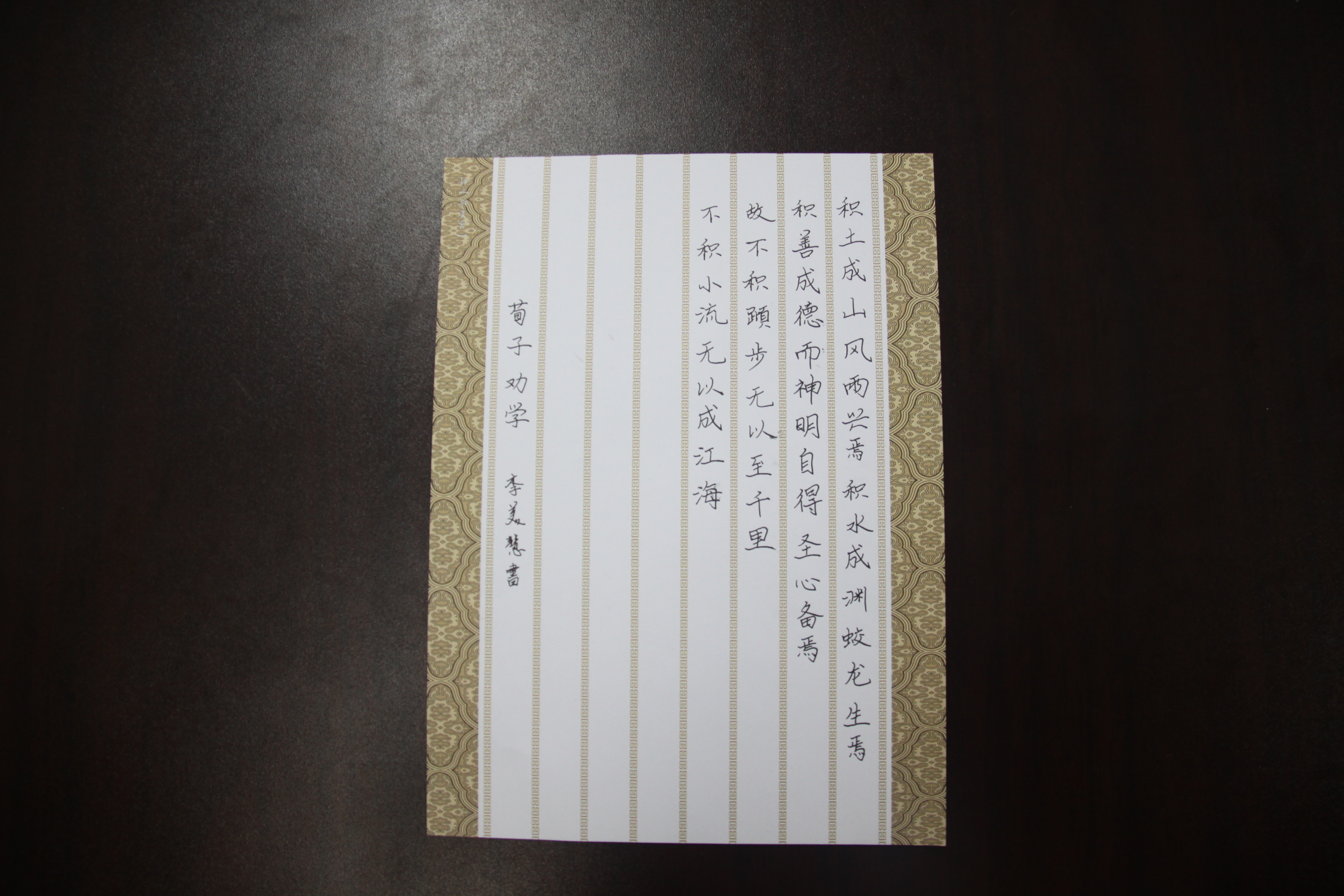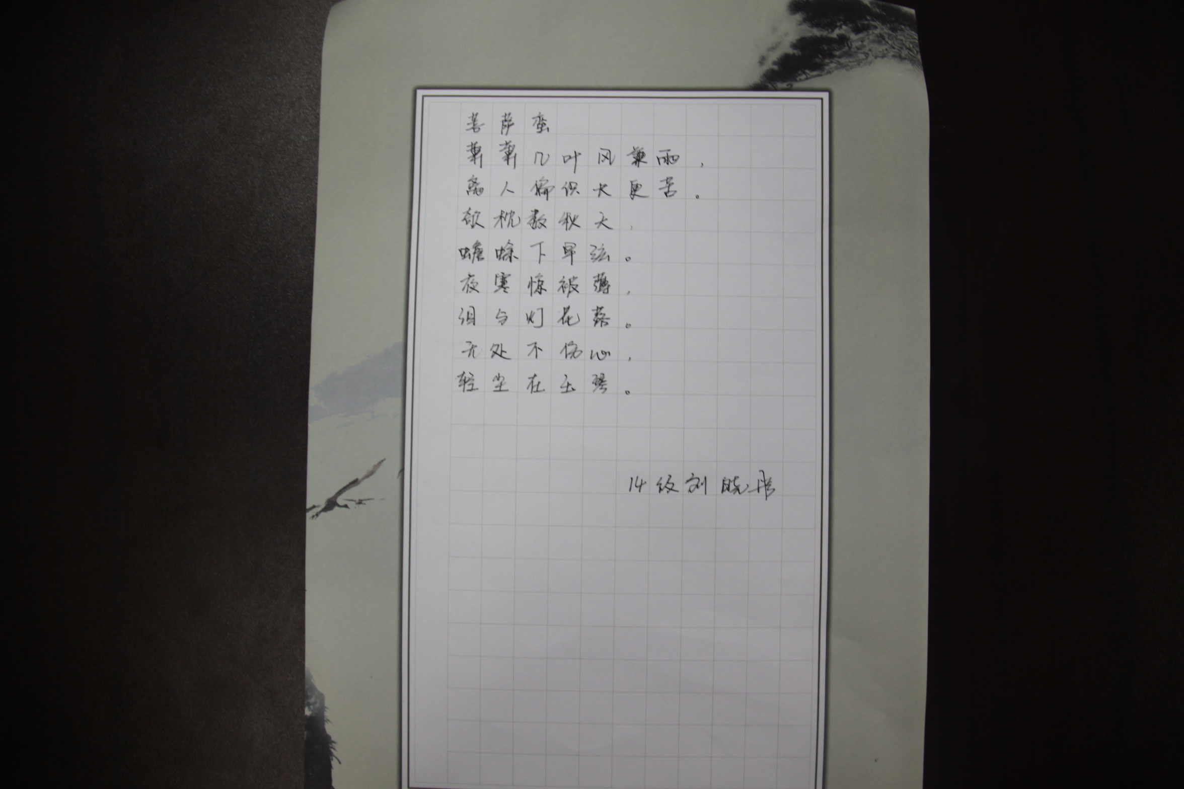 比赛内容为硬笔书法,大赛首轮以一首磅礴大气的《沁园春·雪》作为主题。比赛开始后,选手们奋笔疾书,纷纷散发出“龙威虎振,剑拔弩张”的气势。在书写诗词的同时,选手们也被这词中“山舞银蛇,原驰蜡象,欲与天公试比高”的雄阔豪放意境深深感染。通过首轮的角逐,有六名选手进入第二轮。第二轮比赛为选手自选题材,充分展现了选手们的书法功底。最终,来自2013级的李美慧力压群雄夺得此次书法大赛的第一名。