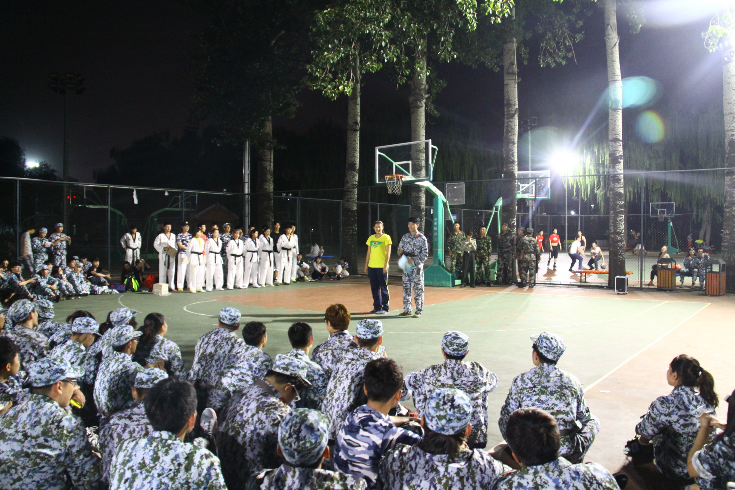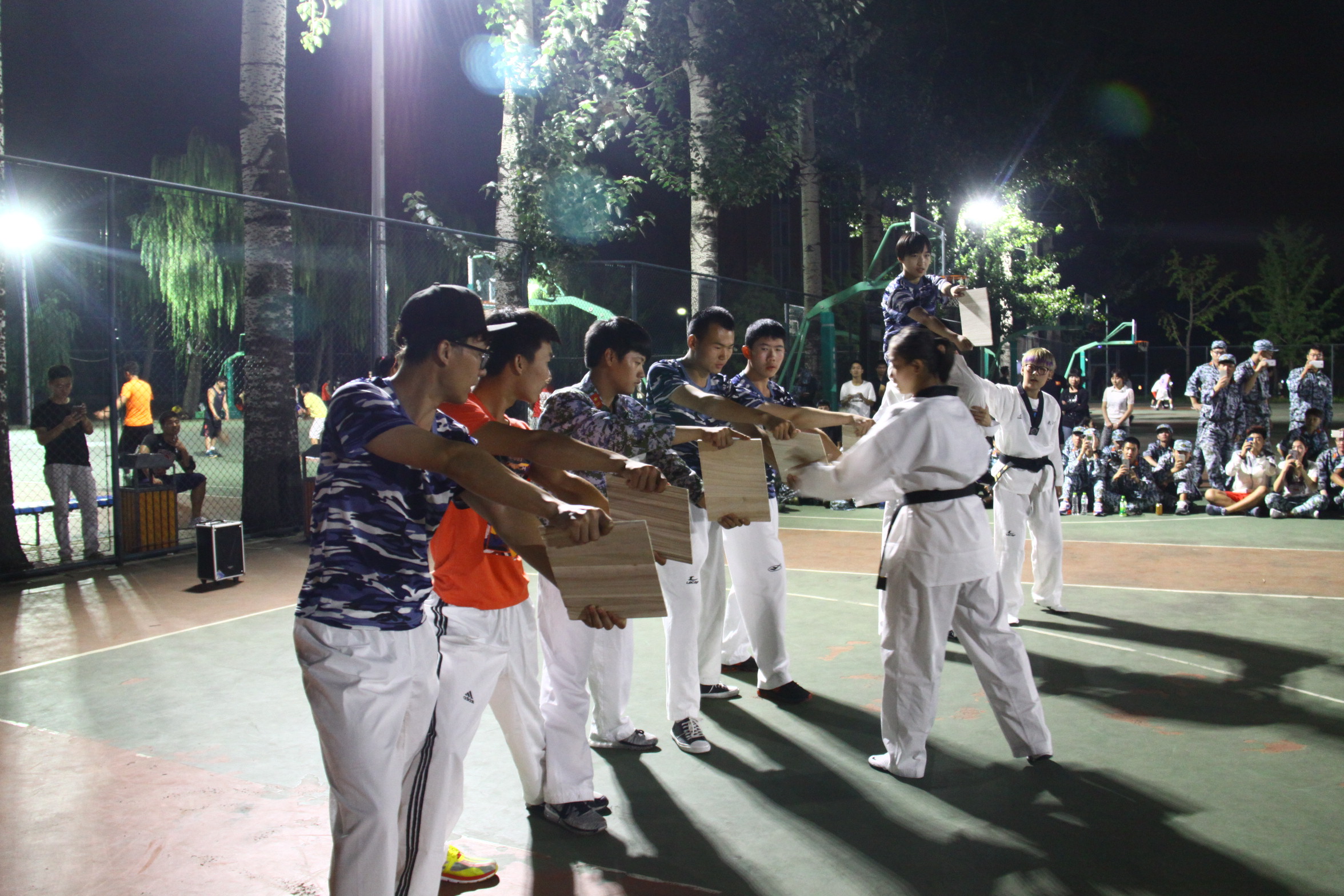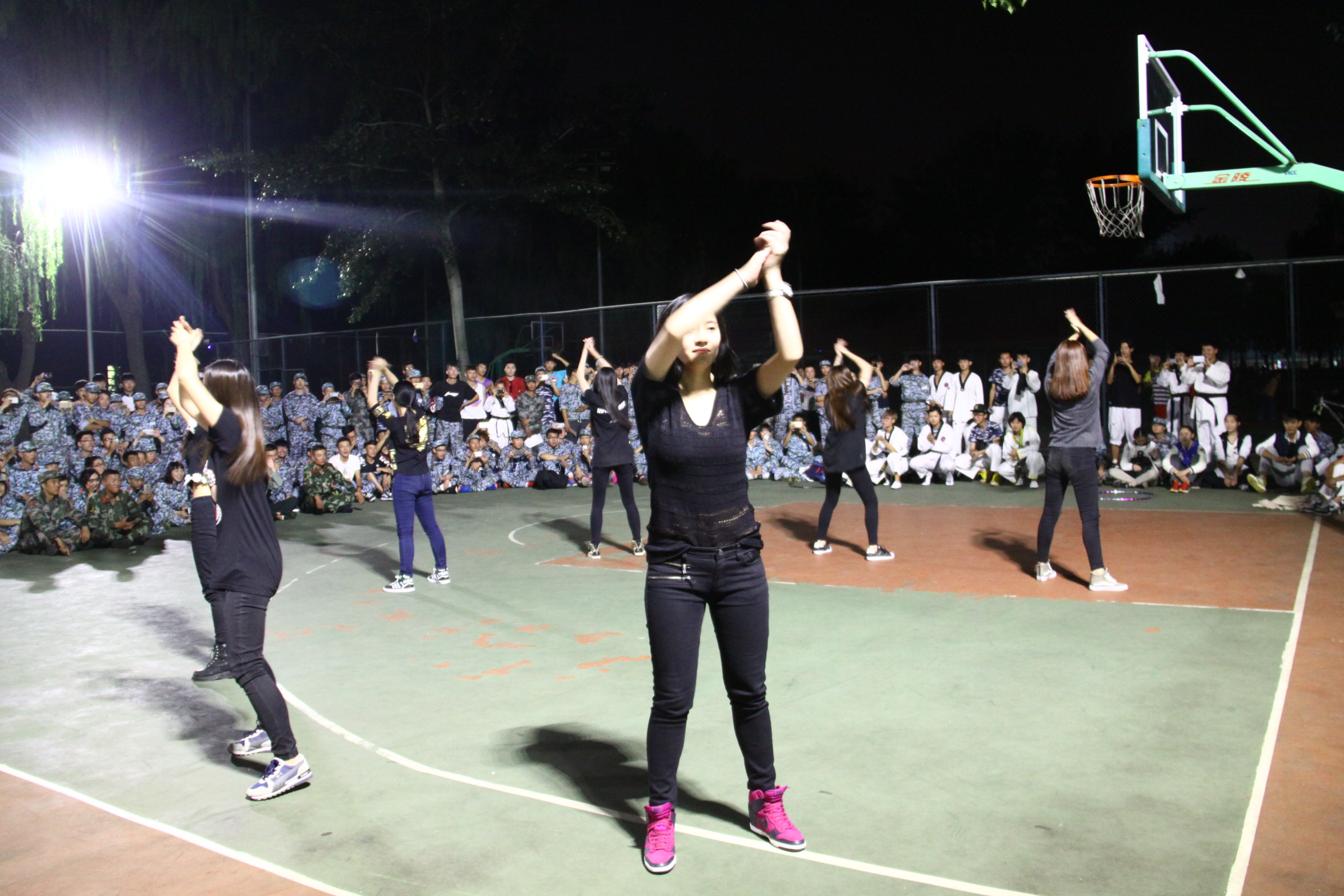 聚光灯下的篮球场变得格外闪耀,晚会以精彩的跆拳道劈板表演拉开帷幕,跆拳道专业的同学用他们帅气的踢腿,霸气的喊声,一次又一次赢得台下同学的掌声。紧接着艺术体操班的女生为同学们带来了动感的舞蹈,掀起了这次晚会的高潮,台下呐喊声不断,同时高大威武的篮球班男生也不甘示弱,随着律动的音乐为大家带来花式灌篮,让台下的同学大饱眼福。最后便是同学们最期待的教官代表表演的各种格斗招式,迅猛的出击,灵活的反应,让同学们钦佩不已,掌声雷动。学院也为教官准备了中秋礼物,为同学们准备了月饼等食物,气氛中弥漫着节日的气息。