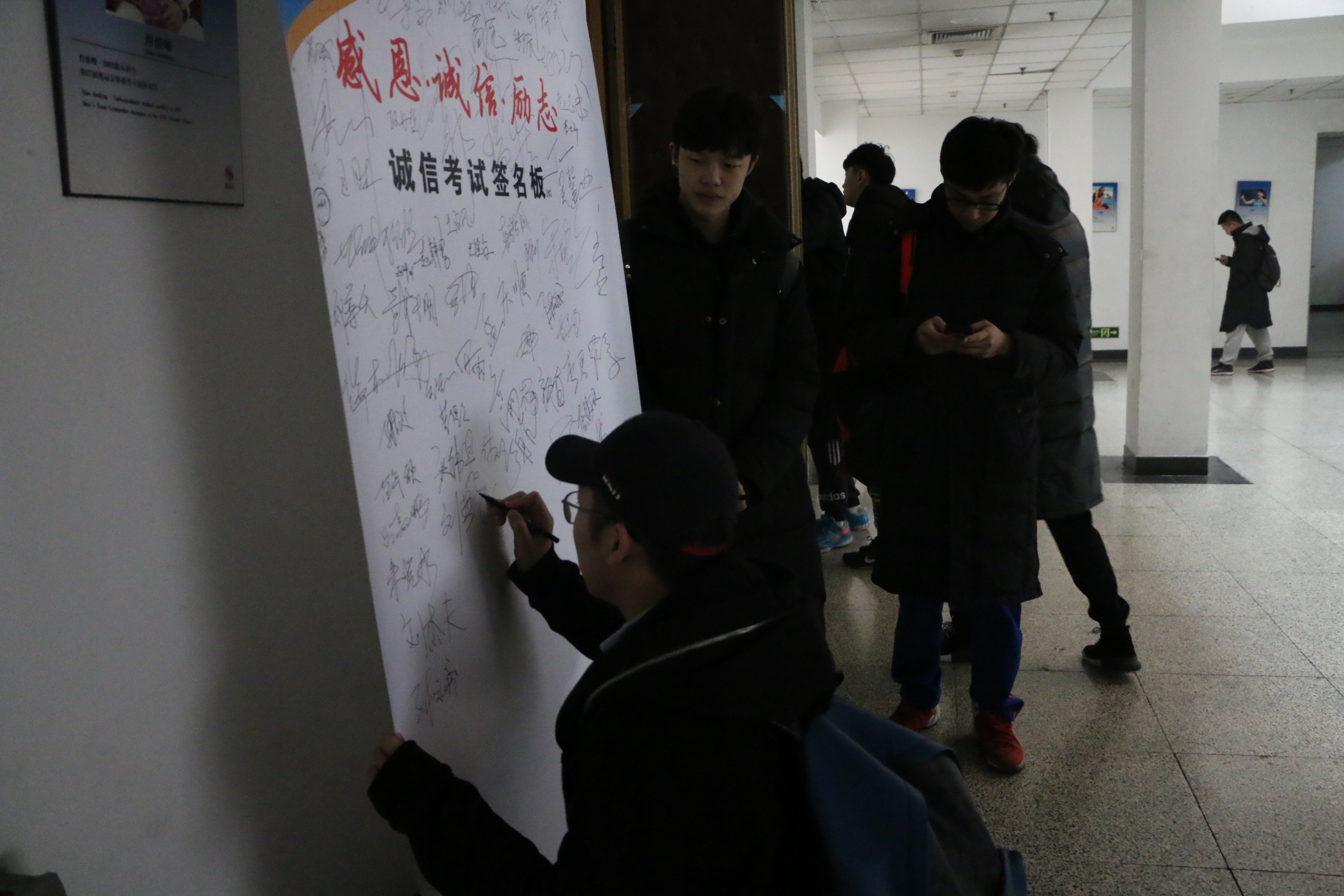 在同学们进场前,在诚信考试签名版上进行了签字仪式,表达了自己诚信考试的决心。活动开始,在主持人介绍完整个活动的的流程后,班级的成果展示环节拉开了帷幕,环环相扣,整个活动流程进行时的十分流畅,主持人幽默的主持风格也为会场氛围增添不少乐趣。各班级的成果展示也都十分精彩,主题鲜明,深入人心,引人深思。在场的学生也十分配合活动的进行,在看到精彩部分时,也毫不吝惜自己的掌声,场面气氛十分热烈。
